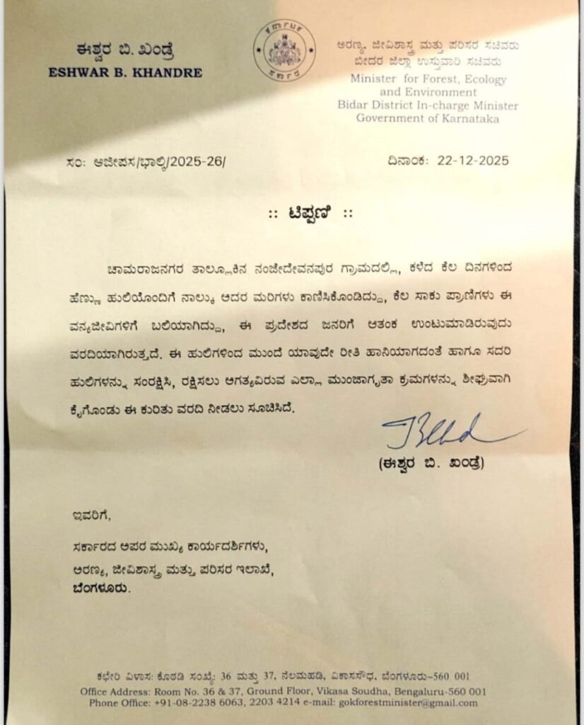 ನಂಜೇದೇವನಪುರ ಗ್ರಾಮದಲ್ಲಿ ಹೆಣ್ಣು ಹುಲಿ ನಾಲ್ಕು ಮರಿಗಳೊಂದಿಗೆ ಕಾಣಿಸಿಕೊಂಡಿದೆ. ಸಾಕು ಪ್ರಾಣಿಗಳೂ ಕೂಡ ಬಲಿಯಾಗಿವೆ. ಜನರೂ ಕೂಡ ಆತಂಕಗೊಂಡಿದ್ದಾರೆ. ಜನರಿಗೆ ಹುಲಿ ಆತಂಕ ದೂರ‌ ಮಾಡುವ ನಿಟ್ಟಿನಲ್ಲಿ ಹುಲಿಗಳನ್ನು ಸಂರಕ್ಷಿಸುವಂತೆ ಅರಣ್ಯ ಸಚಿವ ಈಶ್ವರ ಬಿ ಖಂಡ್ರೆಯವರು ತಕ್ಷಣ ಅರಣ್ಯ ಅಧಿಕಾರಿಗಳಿಗೆ ಸೂಚನೆ‌ ನೀಡಿದ್ದಾರೆ.